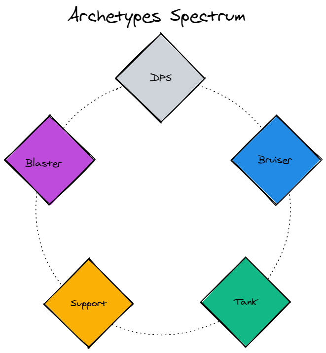 Spells of an archetype follow these guidelines: DPS : focus on average sustained damage per round Blaster: focus on limited high damage Support: focus on heals, buffs and debuffs Tank: focus on debuffs and heals Bruiser: focus on self buffs and self heals