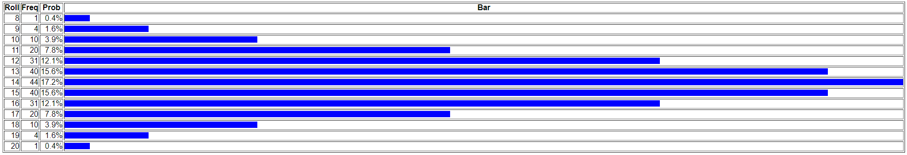 About 90% of the rolls fall between 11 and 17 damage, with an average of 14.