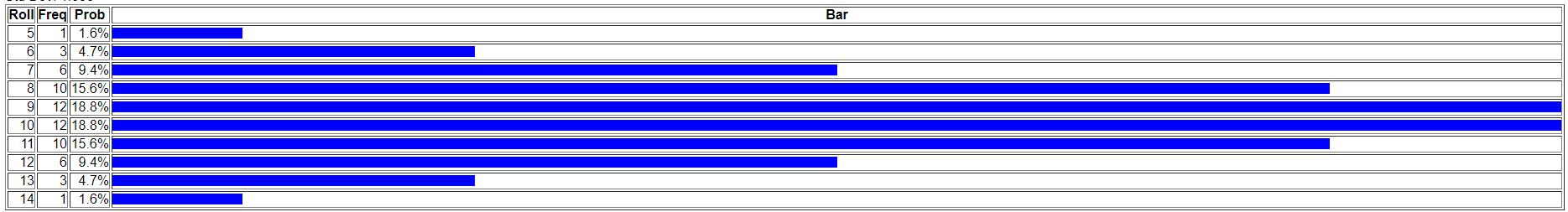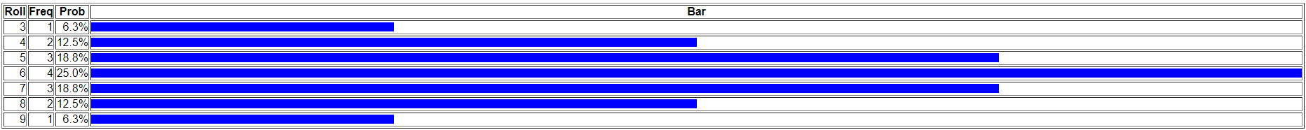 Almost 90% of the rolls fall in the 7 to 12 range, with an average of 9.5.
